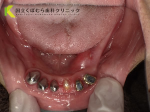 歯周病が進行していて、残念ながら抜歯となってしまった症例です。入れ歯の土台となる部分を付け、治療しました。非常に安定しており、患者さんにもご満足いただきました。下顎は保険の入れ歯です。